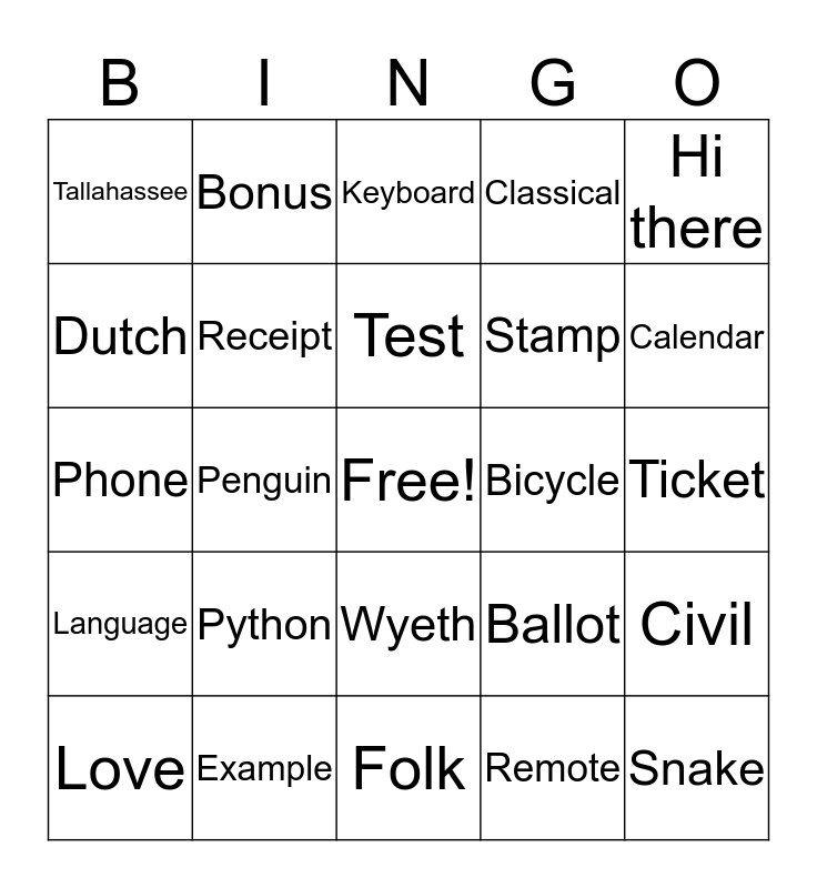 This bingo card has a free space and 24 words: Python, Example, Test, Love, Hi there, Tallahassee, Dutch, Bonus, Bicycle, Wyeth, Stamp, Phone, Ballot, Civil, Receipt, Remote, Ticket, Keyboard, Calendar, Penguin, Snake, Language, Classical and Folk.