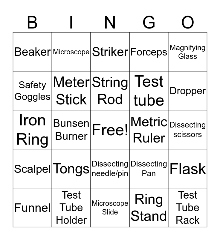 This bingo card has a free space and 24 words: Tongs, Test Tube Holder, String Rod, Funnel, Magnifying Glass, Beaker, Safety Goggles, Microscope, Metric Ruler, Dissecting needle/pin, Test tube, Iron Ring, Dissecting Pan, Flask, Meter Stick, Ring Stand, Dissecting scissors, Striker, Dropper, Bunsen Burner, Test Tube Rack, Scalpel, Forceps and Microscope Slide.