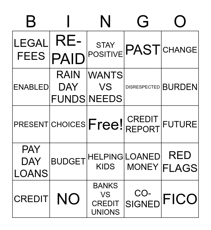 This bingo card has a free space and 24 words: BUDGET, NO, WANTS VS NEEDS, CREDIT, CHANGE, LEGAL FEES, ENABLED, RE-PAID, CREDIT REPORT, HELPING KIDS, DISRESPECTED, PRESENT, LOANED MONEY, RED FLAGS, RAIN DAY FUNDS, CO-SIGNED, FUTURE, STAY POSITIVE, BURDEN, CHOICES, FICO, PAY DAY LOANS, PAST and BANKS VS CREDIT UNIONS.