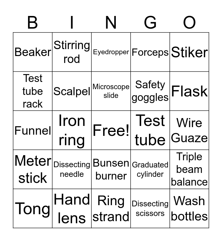 This bingo card has a free space and 24 words: Dissecting needle, Hand lens, Microscope slide, Tong, Stiker, Beaker, Test tube rack, Stirring rod, Test tube, Bunsen burner, Safety goggles, Funnel, Graduated cylinder, Triple beam balance, Scalpel, Dissecting scissors, Wire Guaze, Eyedropper, Flask, Iron ring, Wash bottles, Meter stick, Forceps and Ring strand.