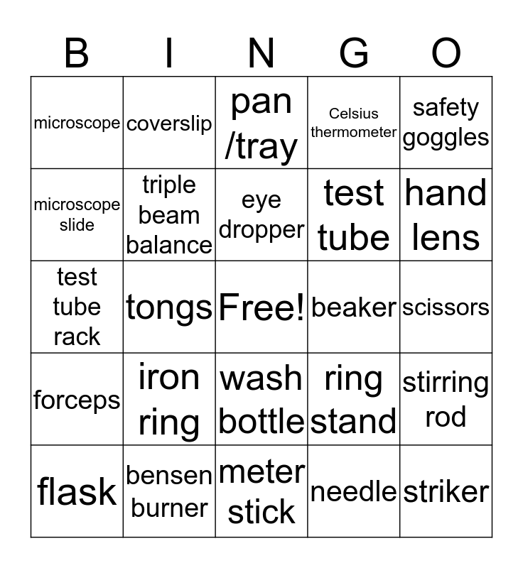This bingo card has a free space and 24 words: iron ring, bensen burner, eye dropper, flask, safety goggles, microscope, microscope slide, coverslip, beaker, wash bottle, test tube, test tube rack, ring stand, stirring rod, triple beam balance, needle, scissors, pan /tray, hand lens, tongs, striker, forceps, Celsius thermometer and meter stick.