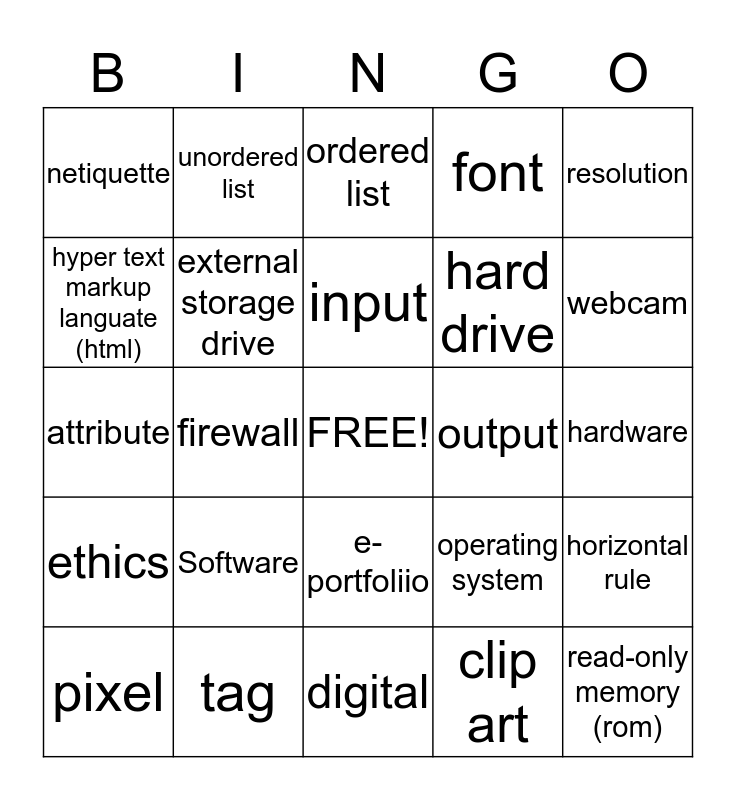 This bingo card has a free space and 24 words: Software, tag, input, pixel, resolution, netiquette, hyper text markup languate (html), unordered list, output, e-portfoliio, hard drive, attribute, operating system, horizontal rule, external storage drive, clip art, hardware, ordered list, webcam, firewall, read-only memory (rom), ethics, font and digital.