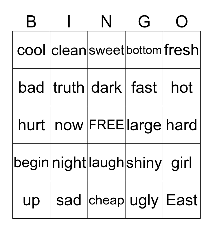 This bingo card has a free space and 24 words: night, sad, dark, up, fresh, cool, bad, clean, large, laugh, fast, hurt, shiny, girl, truth, ugly, hard, sweet, hot, now, East, begin, bottom and cheap.