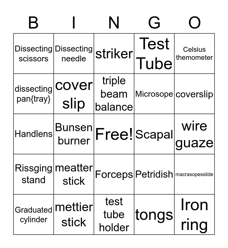 This bingo card has a free space and 24 words: meatter stick, mettier stick, triple beam balance, Graduated cylinder, Celsius themometer, Dissecting scissors, dissecting pan{tray}, Dissecting needle, Scapal, Forceps, Microsope, Handlens, Petridish, macrasopesslide, cover slip, tongs, wire guaze, striker, coverslip, Bunsen burner, Iron ring, Rissging stand, Test Tube and test tube holder.
