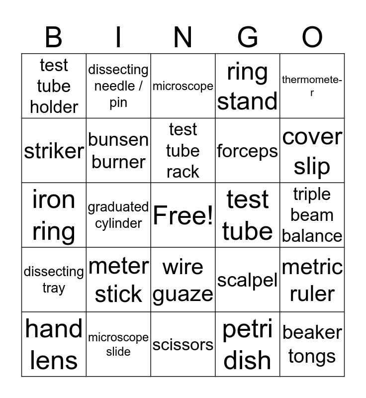 This bingo card has a free space and 24 words: meter stick, microscope slide, test tube rack, hand lens, thermomete-r, test tube holder, striker, dissecting needle / pin, test tube, wire guaze, forceps, iron ring, scalpel, metric ruler, bunsen burner, petri dish, triple beam balance, microscope, cover slip, graduated cylinder, beaker tongs, dissecting tray, ring stand and scissors.