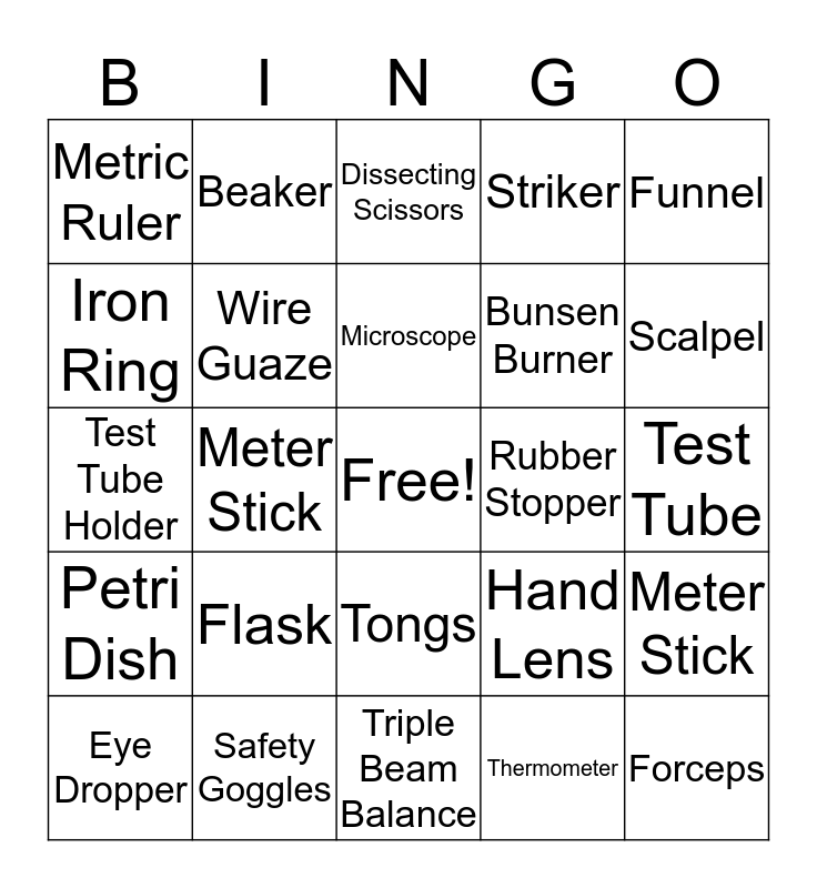 This bingo card has a free space and 24 words: Flask, Safety Goggles, Microscope, Eye Dropper, Funnel, Metric Ruler, Iron Ring, Beaker, Rubber Stopper, Tongs, Bunsen Burner, Test Tube Holder, Hand Lens, Meter Stick, Wire Guaze, Thermometer, Test Tube, Dissecting Scissors, Scalpel, Meter Stick, Forceps, Petri Dish, Striker and Triple Beam Balance.