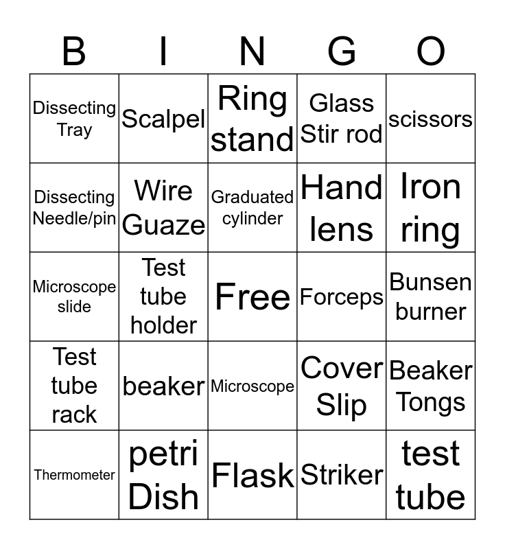 This bingo card has a free space and 24 words: beaker, petri Dish, Graduated cylinder, Thermometer, scissors, Dissecting Tray, Dissecting Needle/pin, Scalpel, Forceps, Microscope, Hand lens, Microscope slide, Cover Slip, Beaker Tongs, Wire Guaze, Striker, Bunsen burner, Ring stand, Iron ring, Test tube holder, test tube, Test tube rack, Glass Stir rod and Flask.