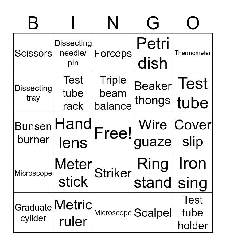 This bingo card has a free space and 24 words: Meter stick, Metric ruler, Triple beam balance, Graduate cylider, Thermometer, Scissors, Dissecting tray, Dissecting needle/ pin, Wire guaze, Striker, Beaker thongs, Bunsen burner, Ring stand, Iron sing, Test tube rack, Scalpel, Cover slip, Forceps, Test tube, Hand lens, Test tube holder, Microscope, Petri dish and Microscope.