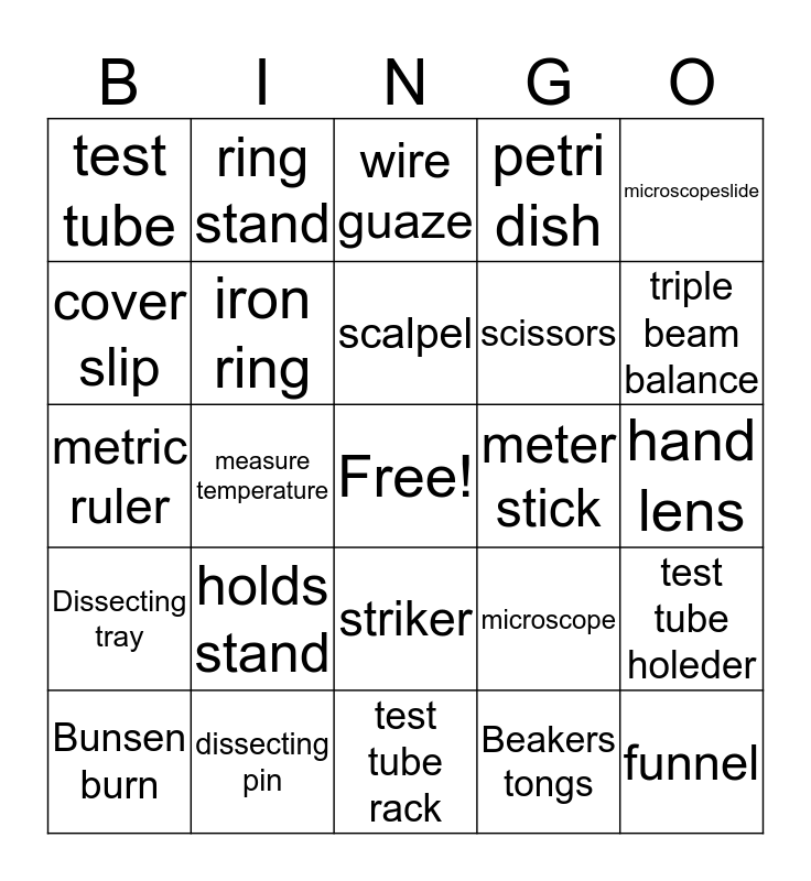 This bingo card has a free space and 24 words: holds stand, dissecting pin, scalpel, Bunsen burn, microscopeslide, test tube, cover slip, ring stand, meter stick, striker, scissors, metric ruler, microscope, test tube holeder, iron ring, Beakers tongs, hand lens, wire guaze, triple beam balance, measure temperature, funnel, Dissecting tray, petri dish and test tube rack.