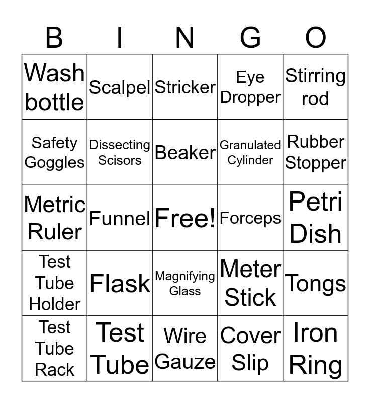 This bingo card has a free space and 24 words: Flask, Test Tube, Beaker, Test Tube Rack, Stirring rod, Wash bottle, Safety Goggles, Scalpel, Forceps, Magnifying Glass, Granulated Cylinder, Metric Ruler, Meter Stick, Tongs, Dissecting Scisors, Cover Slip, Petri Dish, Stricker, Rubber Stopper, Funnel, Iron Ring, Test Tube Holder, Eye Dropper and Wire Gauze.