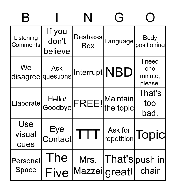 This bingo card has a free space and 24 words: Eye Contact, The Five, Interrupt, Personal Space, Body positioning, Listening Comments, We disagree, If you don't believe, Maintain the topic, TTT, NBD, Elaborate, Ask for repetition, Topic, Ask questions, That's great!, That's too bad., Destress Box, I need one minute, please., Hello/ Goodbye, push in chair, Use visual cues, Language and Mrs. Mazzei.