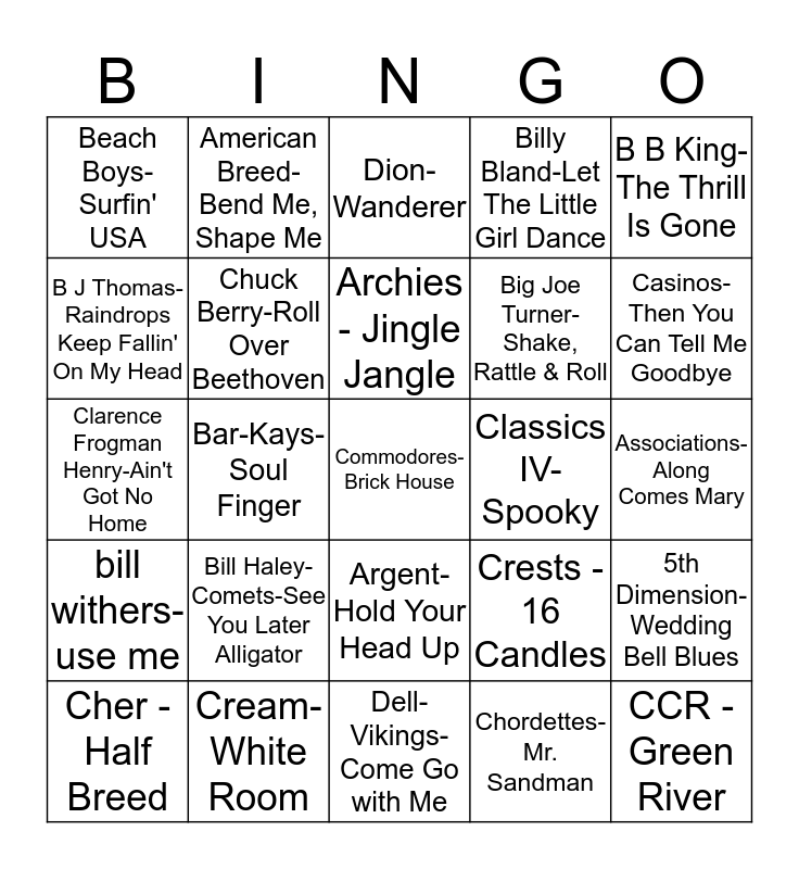 This bingo card has 64 words: 4 Seasons-Sherry, 4 Tops-It's The Same Old Song, 5 Satins-In The Still Of The Night, 5th Dimension-Wedding Bell Blues, Abba-Waterloo, America-A Horse With No Name, American Breed-Bend Me, Shape Me, Animals-See See Rider, Archies - Jingle Jangle, Aretha Franklin-Think, Argent-Hold Your Head Up, Association, The-Windy, Associations-Along Comes Mary, B B King-The Thrill Is Gone, B J Thomas-Hooked On A Feeling, B J Thomas-Raindrops Keep Fallin' On My Head, Bar-Kays-Soul Finger, Beach Boys-Surfin' USA, Beatles-We Can Work It Out, Big Joe Turner-Shake, Rattle & Roll, Bill Haley-Comets-See You Later Alligator, bill withers-use me, Billy Bland-Let The Little Girl Dance, billy paul-me & mrs. jones., billy preston-nothing from nothing, Bob Seger-Ramblin' Gamblin' Man, bobby day-little bitty pretty one, Bobby Vee-Devil Or Angel, Bobby Vinton-Roses Are Red, Booker T And The MGs-Green Onions, Bryan Hyland-Itsy Bitsy Teeny Weeny Yellow Polka Dot Bikini, Buckinghams-Kind Of A Drag, Byrds-Turn, Turn, Turn, Cash, Johnny-Folsom Prison Blues, Casinos-Then You Can Tell Me Goodbye, Cher - Half Breed, Chiffons-One Fine Day, Chordettes-Mr. Sandman, Chuck Berry-My Ding-A-Ling, Chuck Berry-Roll Over Beethoven, Clarence Frogman Henry-Ain't Got No Home, Classics IV-Spooky, Cliff Richard - Devil Woman, clovers-love potion no. 9, Coasters-Poison Ivy, Commodores-Brick House, Cream-White Room, CCR - Green River, Crests - 16 Candles, Dave Baby Cortez-Happy Organ, Dave Clark Five-Needles and Pins, Dells-Oh What a Night, Dell-Vikings-Come Go with Me, Diamonds-Little Darlin', Diamonds-Why Do Fools Fall in Love, diana ross-i'm coming out, Dion-Wanderer, doobie brothers-china grove, Drifters-Under The Boardwalk, Drifters-Up On The Roof, Jackson 5-ABC, Jr. Walker and the All Stars-Shotgun, Marvin Gaye-I heard it through the grapevine and Marvin Gaye-Let's Get it On.