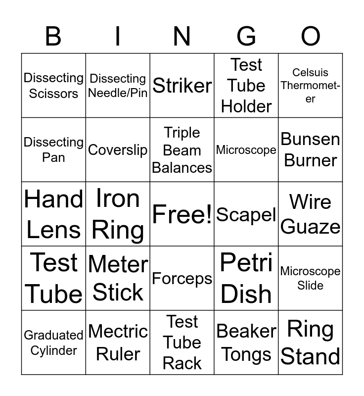 This bingo card has a free space and 24 words: Meter Stick, Mectric Ruler, Triple Beam Balances, Graduated Cylinder, Celsuis Thermomet-er, Dissecting Scissors, Dissecting Pan, Dissecting Needle/Pin, Scapel, Forceps, Microscope, Hand Lens, Petri Dish, Microscope Slide, Coverslip, Beaker Tongs, Wire Guaze, Striker, Bunsen Burner, Iron Ring, Ring Stand, Test Tube, Test Tube Holder and Test Tube Rack.