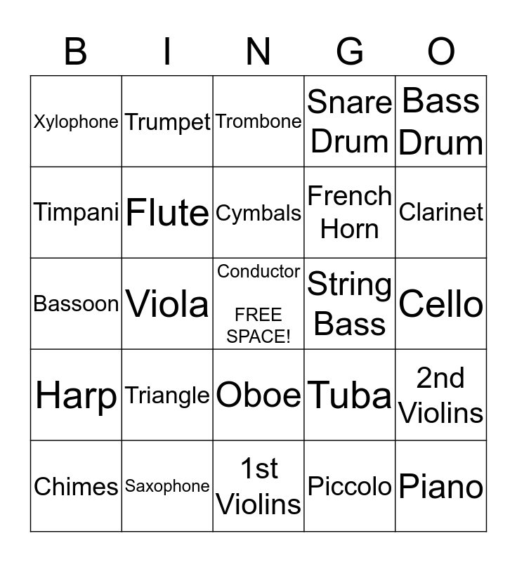 This bingo card has a free space and 24 words: Triangle, Saxophone, Cymbals, Chimes, Bass Drum, Xylophone, Timpani, Trumpet, String Bass, Oboe, French Horn, Bassoon, Tuba, 2nd Violins, Flute, Piccolo, Cello, Trombone, Clarinet, Viola, Piano, Harp, Snare Drum and 1st Violins.