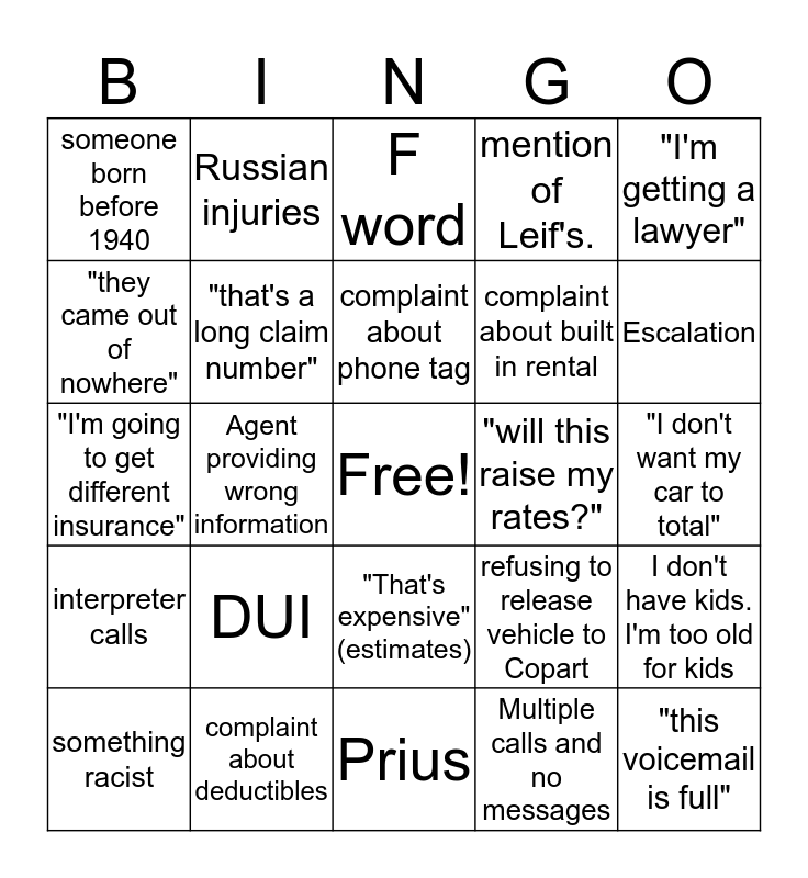 This bingo card has a free space and 24 words: DUI, complaint about deductibles, complaint about phone tag, something racist, "I'm getting a lawyer", someone born before 1940, "they came out of nowhere", Russian injuries, "will this raise my rates?", "That's expensive" (estimates), complaint about built in rental, "I'm going to get different insurance", refusing to release vehicle to Copart, I don't have kids. I'm too old for kids, "that's a long claim number", Multiple calls and no messages, "I don't want my car to total", F word, Escalation, Agent providing wrong information, "this voicemail is full", interpreter calls, mention of Leif's. and Prius.