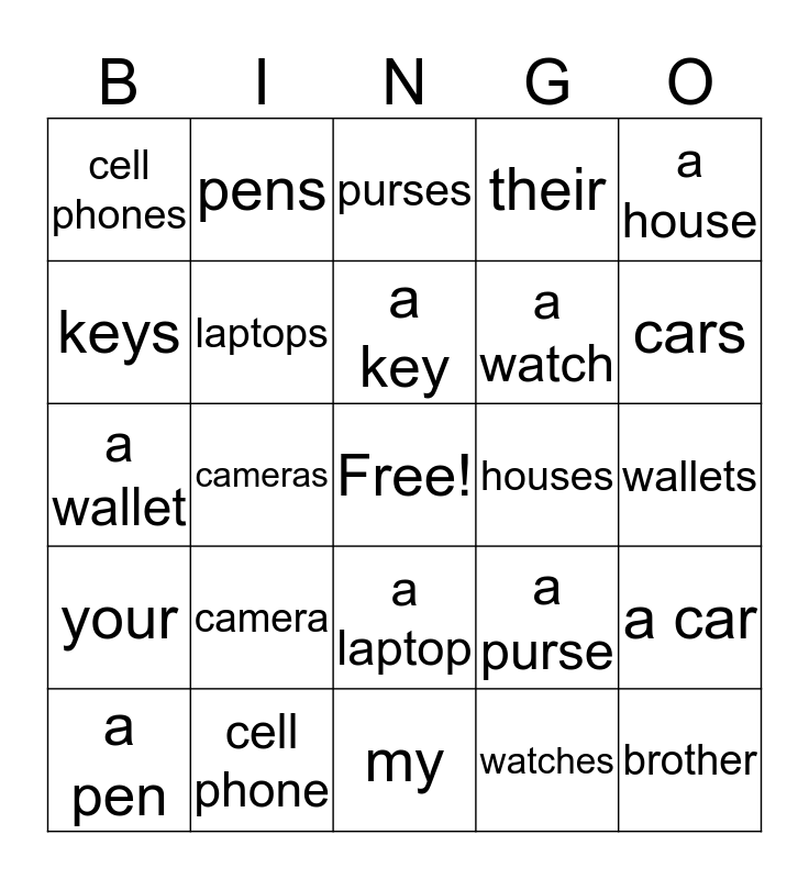 This bingo card has a free space and 24 words: camera, cell phone, a key, a pen, a house, cell phones, keys, pens, houses, a laptop, a watch, a wallet, a purse, a car, laptops, watches, wallets, purses, cars, cameras, brother, your, their and my.