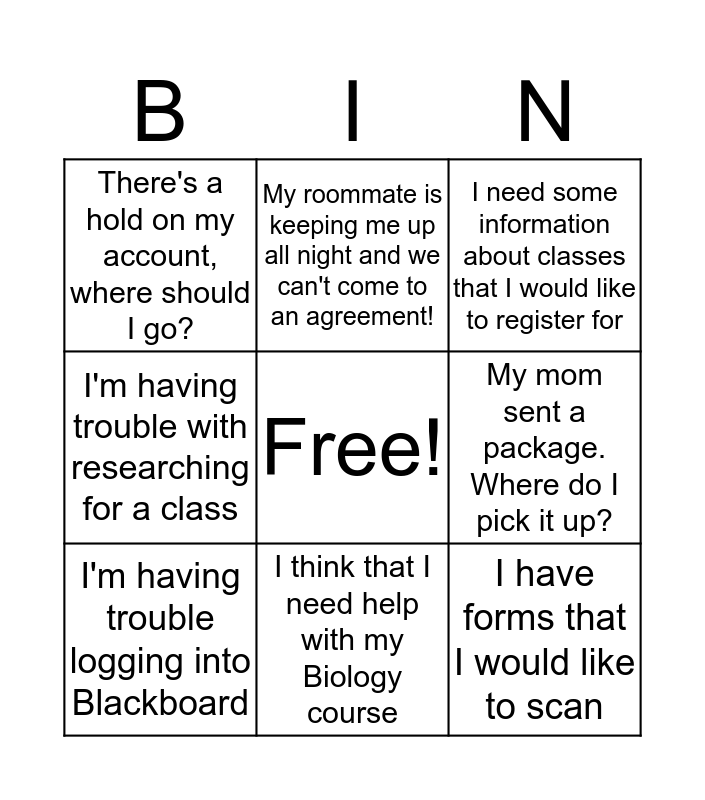 This bingo card has a free space and 8 words: My mom sent a package. Where do I pick it up?, I need some information about classes that I would like to register for, My roommate is keeping me up all night and we can't come to an agreement!, I'm having trouble logging into Blackboard, There's a hold on my account, where should I go?, I have forms that I would like to scan, I'm having trouble with researching for a class and I think that I need help with my Biology course.