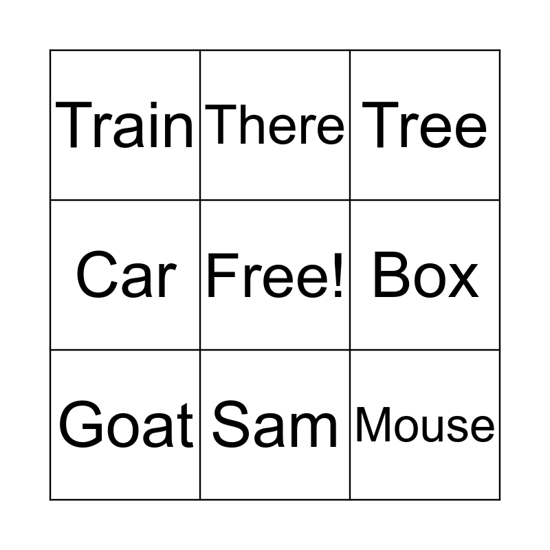 This bingo card has a free space and 8 words: Box, Tree, There, Goat, Train, Mouse, Car and Sam.