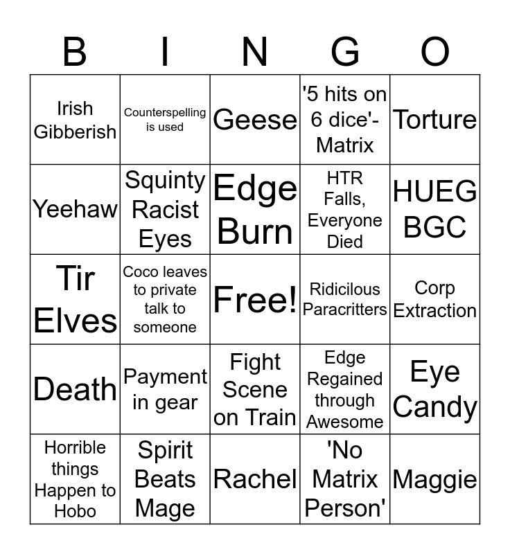 This bingo card has a free space and 24 words: Payment in gear, Spirit Beats Mage, Edge Burn, Horrible things Happen to Hobo, Torture, Irish Gibberish, Yeehaw, Counterspelling is used, Ridicilous Paracritters, Fight Scene on Train, HTR Falls, Everyone Died, Tir Elves, Edge Regained through Awesome, Eye Candy, Squinty Racist Eyes, 'No Matrix Person', Corp Extraction, Geese, HUEG BGC, Coco leaves to private talk to someone, Maggie, Death, '5 hits on 6 dice'-Matrix and Rachel.