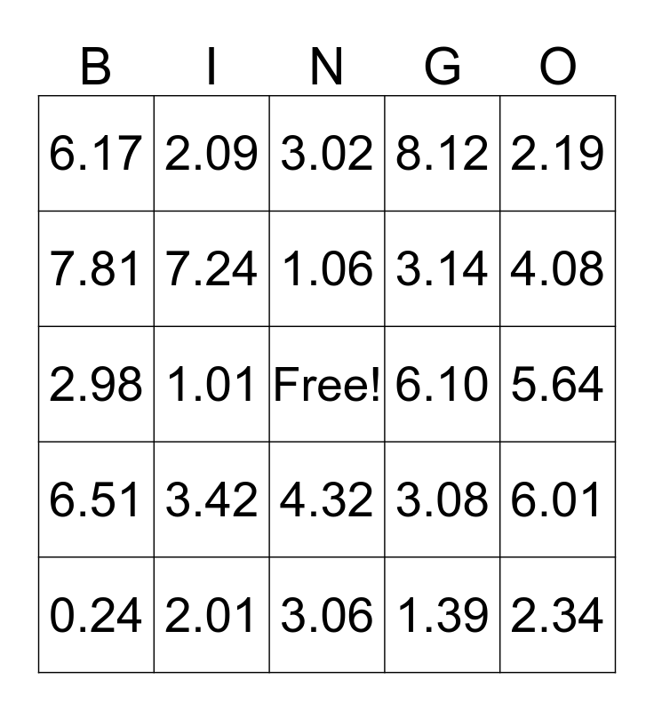 This bingo card has a free space and 24 words: 3.42, 2.01, 1.06, 0.24, 2.19, 6.17, 7.81, 2.09, 6.10, 4.32, 3.14, 2.98, 3.08, 6.01, 7.24, 1.39, 5.64, 3.02, 4.08, 1.01, 2.34, 6.51, 8.12 and 3.06.