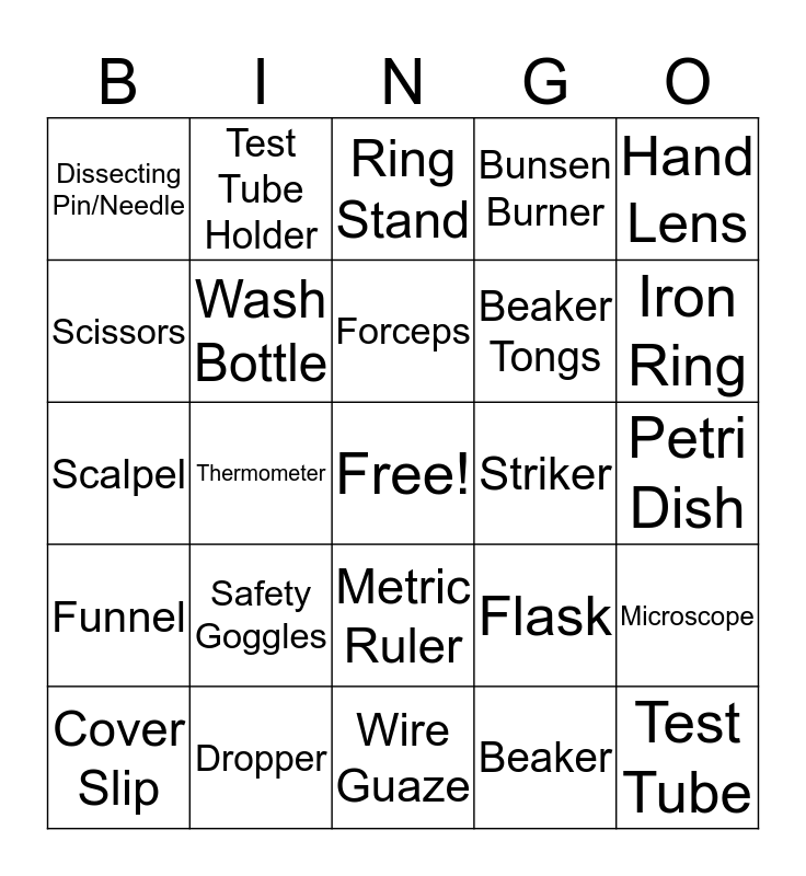 This bingo card has a free space and 24 words: Safety Goggles, Dropper, Forceps, Cover Slip, Hand Lens, Dissecting Pin/Needle, Scissors, Test Tube Holder, Striker, Metric Ruler, Beaker Tongs, Scalpel, Flask, Microscope, Wash Bottle, Beaker, Petri Dish, Ring Stand, Iron Ring, Thermometer, Test Tube, Funnel, Bunsen Burner and Wire Guaze.