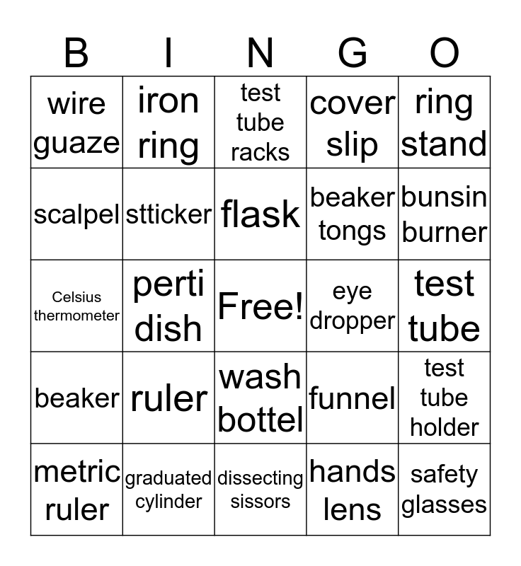 This bingo card has a free space and 24 words: ruler, graduated cylinder, flask, metric ruler, ring stand, wire guaze, scalpel, iron ring, eye dropper, wash bottel, beaker tongs, Celsius thermometer, funnel, test tube holder, stticker, hands lens, test tube, test tube racks, bunsin burner, perti dish, safety glasses, beaker, cover slip and dissecting sissors.