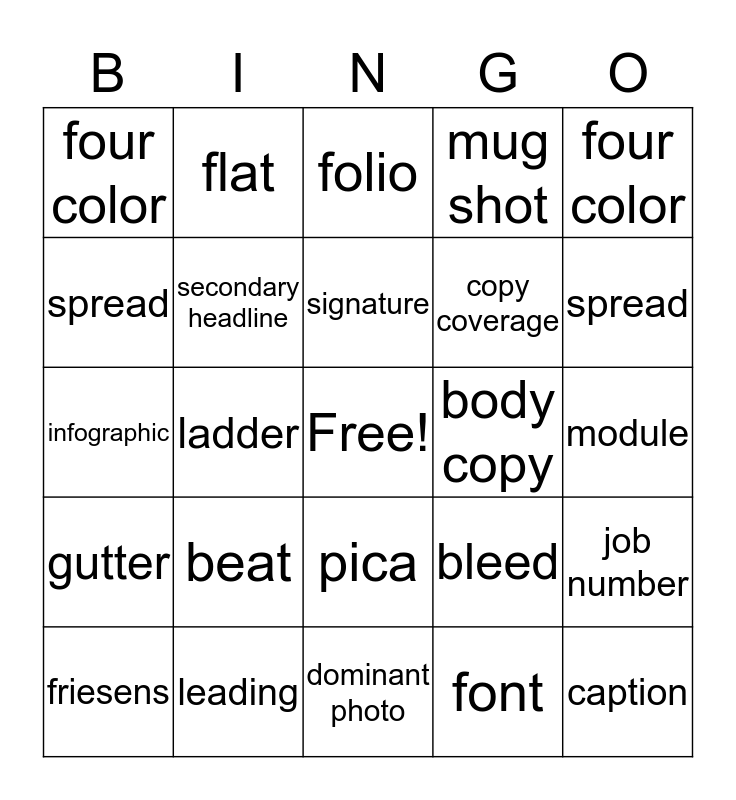 This bingo card has a free space and 24 words: beat, leading, signature, friesens, four color, four color, spread, flat, body copy, pica, copy coverage, infographic, bleed, job number, secondary headline, font, module, folio, spread, ladder, caption, gutter, mug shot and dominant photo.