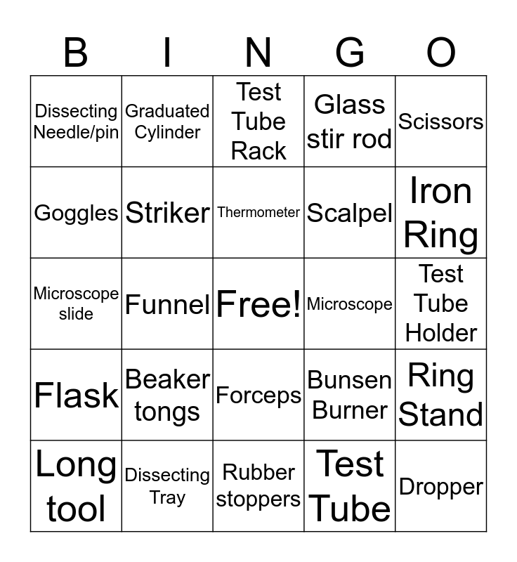 This bingo card has a free space and 24 words: Beaker tongs, Dissecting Tray, Thermometer, Long tool, Scissors, Dissecting Needle/pin, Goggles, Graduated Cylinder, Microscope, Forceps, Scalpel, Microscope slide, Bunsen Burner, Ring Stand, Striker, Test Tube, Test Tube Holder, Test Tube Rack, Iron Ring, Funnel, Dropper, Flask, Glass stir rod and Rubber stoppers.