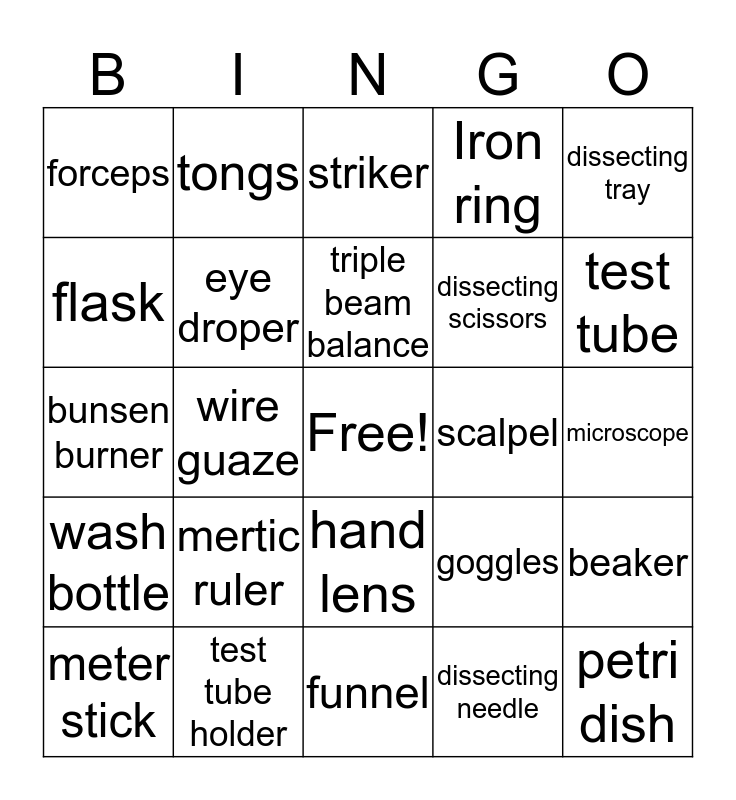 This bingo card has a free space and 24 words: meter stick, mertic ruler, triple beam balance, dissecting needle, dissecting tray, forceps, tongs, striker, scalpel, microscope, bunsen burner, eye droper, goggles, beaker, flask, test tube holder, funnel, Iron ring, test tube, wash bottle, wire guaze, hand lens, dissecting scissors and petri dish.