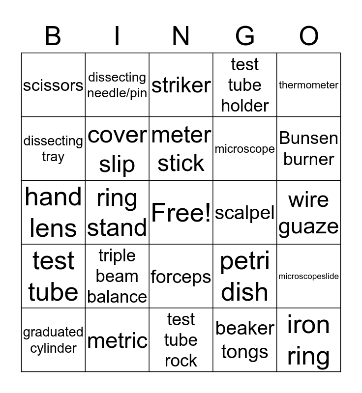 This bingo card has a free space and 24 words: triple beam balance, metric, meter stick, graduated cylinder, thermometer, scissors, dissecting tray, dissecting needle/pin, scalpel, forceps, microscope, hand lens, petri dish, microscopeslide, cover slip, beaker tongs, wire guaze, striker, Bunsen burner, ring stand, iron ring, test tube, test tube holder and test tube rock.