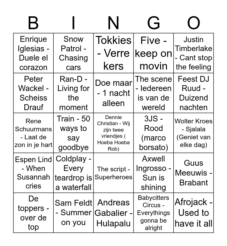 This bingo card has 25 words: Coldplay - Every teardrop is a waterfall, Andreas Gabalier - Hulapalu, Doe maar - 1 nacht alleen, De toppers - over de top, Justin Timberlake - Cant stop the feeling, Enrique Iglesias - Duele el corazon, Peter Wackel - Scheiss Drauf, Snow Patrol - Chasing cars, 3JS - Rood (marco borsato), The script - Superheroes, The scene - Iedereen is van de wereld, Rene Schuurmans - Laat de zon in je hart, Axwell Ingrosso - Sun is shining, Guus Meeuwis - Brabant, Ran-D - Living for the moment, Afrojack - Used to have it all, Wolter Kroes - Sjalala (Geniet van elke dag), Tokkies - Verre kers, Feest DJ Ruud -Duizend nachten, Train - 50 ways to say goodbye, Dennie Christian - Wij zijn twee vriendjes ( Hoeba Hoeba Rob), Sam Feldt - Summer on you, Espen Lind - When Susannah cries, Five - keep on movin and Babycitters Circus - Everythings gonna be alright.