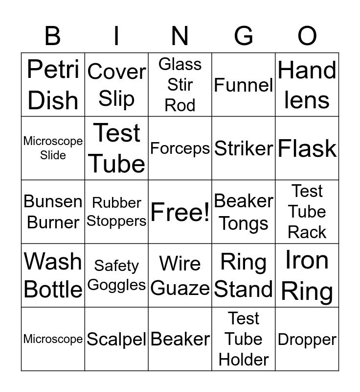 This bingo card has a free space and 24 words: Safety Goggles, Scalpel, Forceps, Microscope, Hand lens, Petri Dish, Microscope Slide, Cover Slip, Beaker Tongs, Wire Guaze, Striker, Bunsen Burner, Ring Stand, Iron Ring, Test Tube, Test Tube Holder, Test Tube Rack, Glass Stir Rod, Flask, Rubber Stoppers, Dropper, Wash Bottle, Funnel and Beaker.