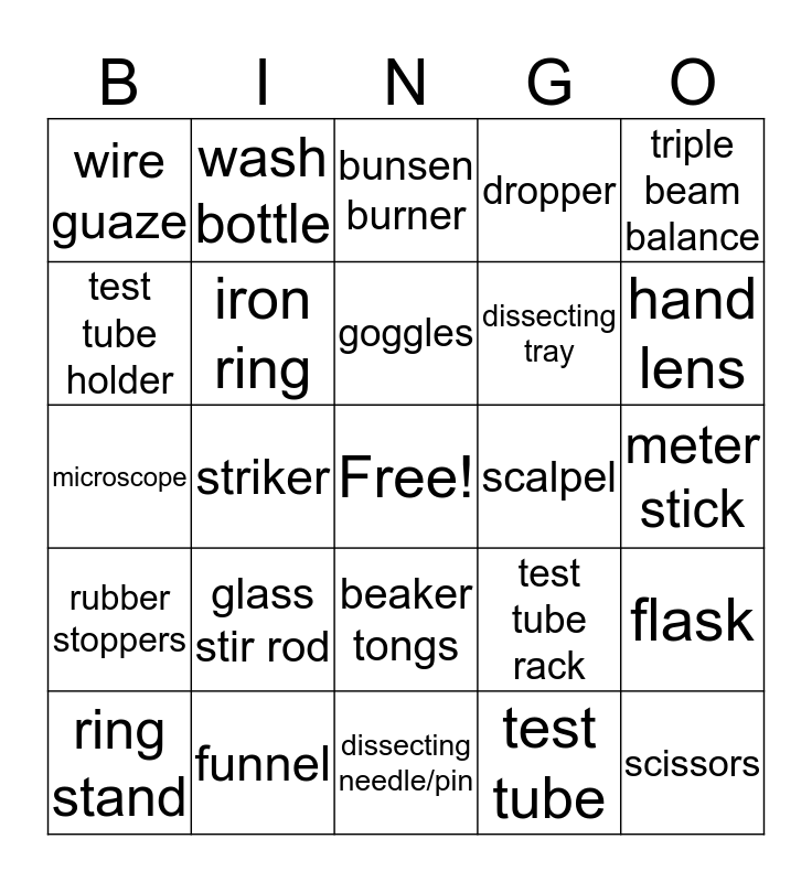 This bingo card has a free space and 24 words: glass stir rod, funnel, goggles, ring stand, triple beam balance, wire guaze, test tube holder, wash bottle, scalpel, beaker tongs, dissecting tray, microscope, test tube rack, flask, iron ring, test tube, meter stick, bunsen burner, hand lens, striker, scissors, rubber stoppers, dropper and dissecting needle/pin.