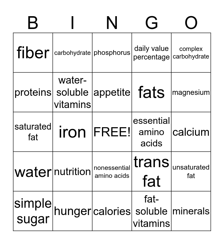 This bingo card has a free space and 24 words: nutrition, hunger, appetite, simple sugar, complex carbohydrate, fiber, proteins, carbohydrate, essential amino acids, nonessential amino acids, fats, saturated fat, trans fat, unsaturated fat, water-soluble vitamins, fat-soluble vitamins, calcium, phosphorus, magnesium, iron, minerals, water, daily value percentage and calories.
