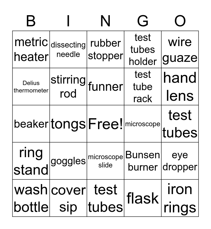 This bingo card has a free space and 24 words: goggles, cover sip, funner, wash bottle, wire guaze, metric heater, Delius thermometer, dissecting needle, microscope, microscope slide, test tube rack, beaker, Bunsen burner, eye dropper, stirring rod, flask, test tubes, rubber stopper, hand lens, tongs, iron rings, ring stand, test tubes holder and test tubes.