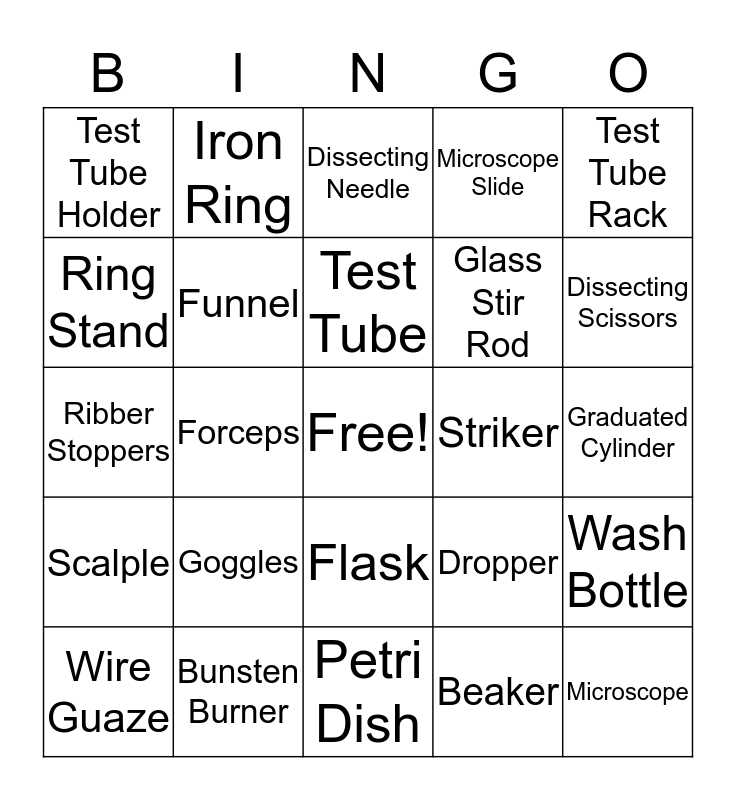 This bingo card has a free space and 24 words: Goggles, Bunsten Burner, Test Tube, Wire Guaze, Test Tube Rack, Test Tube Holder, Ring Stand, Iron Ring, Striker, Flask, Glass Stir Rod, Ribber Stoppers, Dropper, Wash Bottle, Funnel, Beaker, Graduated Cylinder, Dissecting Needle, Dissecting Scissors, Forceps, Microscope, Scalple, Microscope Slide and Petri Dish.