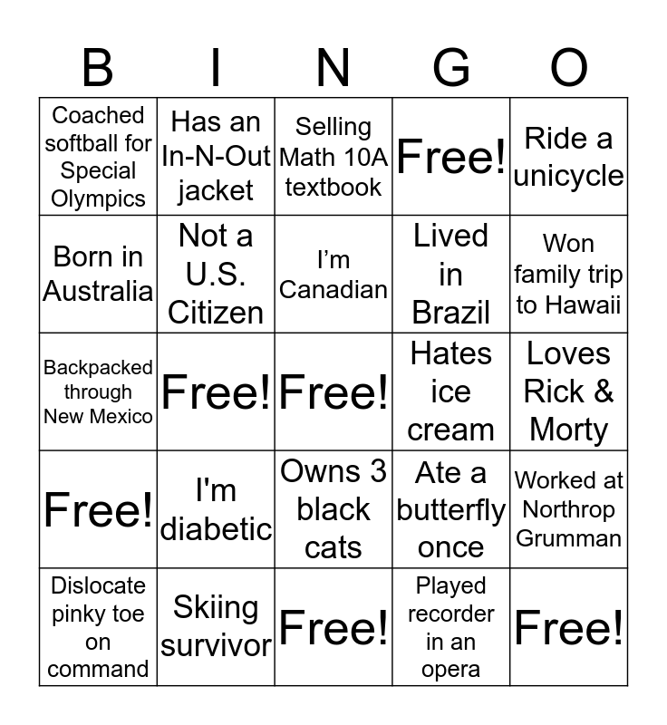This bingo card has a free space and 24 words: I'm diabetic, Skiing survivor, I’m Canadian, Dislocate pinky toe on command, Ride a unicycle, Coached softball for Special Olympics, Born in Australia, Has an In-N-Out jacket, Hates ice cream, Owns 3 black cats, Lived in Brazil, Backpacked through New Mexico, Ate a butterfly once, Worked at Northrop Grumman, Not a U.S. Citizen, Played recorder in an opera, Loves Rick & Morty, Selling Math 10A textbook, Won family trip to Hawaii, Free!, Free!, Free!, Free! and Free!.
