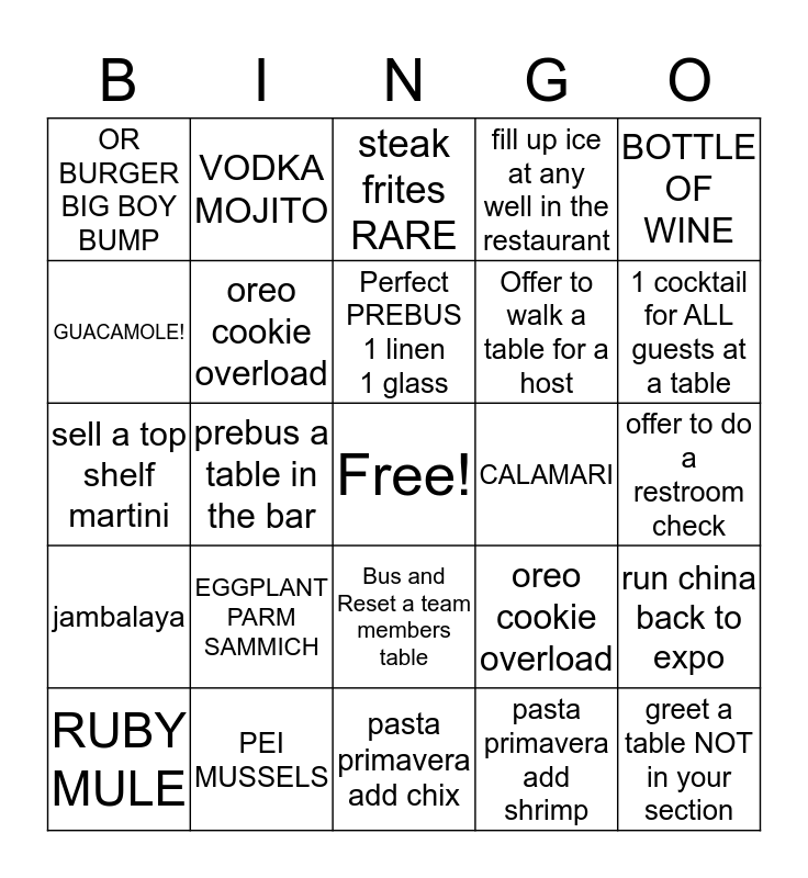 This bingo card has a free space and 24 words: EGGPLANT PARM SAMMICH, PEI MUSSELS, Perfect PREBUS 1 linen 1 glass, RUBY MULE, BOTTLE OF WINE, OR BURGER BIG BOY BUMP, GUACAMOLE!, VODKA MOJITO, CALAMARI, Bus and Reset a team members table, Offer to walk a table for a host, sell a top shelf martini, oreo cookie overload, run china back to expo, oreo cookie overload, pasta primavera add shrimp, offer to do a restroom check, steak frites RARE, 1 cocktail for ALL guests at a table, prebus a table in the bar, greet a table NOT in your section, jambalaya, fill up ice at any well in the restaurant and pasta primavera add chix.