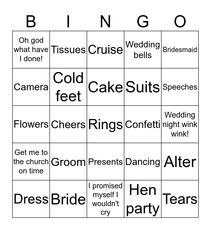 This bingo card has a free space and 24 words: Groom, Bride, Cake, Dress, Bridesmaid, Oh god what have I done!, Camera, Tissues, Confetti, Presents, Suits, Flowers, Dancing, Alter, Cold feet, Hen party, Wedding night wink wink!, Cruise, Speeches, Cheers, Tears, Get me to the church on time, Wedding bells and I promised myself I wouldn't cry.