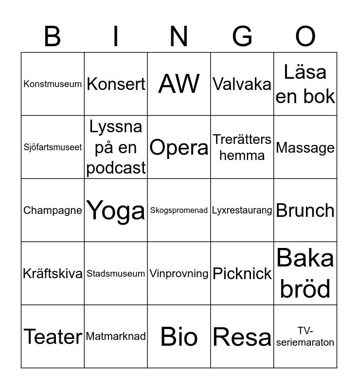 This bingo card has 25 words: Stadsmuseum, Bio, Opera, Teater, Läsa en bok, Konstmuseum, Sjöfartsmuseet, Konsert, Lyxrestaurang, Vinprovning, Trerätters hemma, Champagne, Picknick, Baka bröd, Lyssna på en podcast, TV-seriemaraton, Brunch, AW, Massage, Yoga, Skogspromenad, Matmarknad, Kräftskiva, Valvaka and Resa.