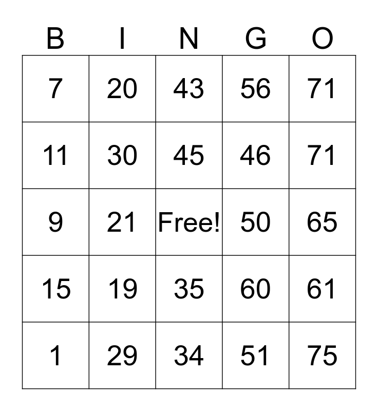 This bingo card has a free space and 24 words: 1, 19, 45, 51, 71, 7, 20, 43, 50, 65, 9, 30, 60, 61, 11, 29, 34, 56, 71, 15, 21, 35, 46 and 75.