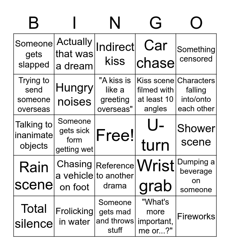 This bingo card has a free space and 39 words: UK flag, Someone gets hit by a car, Kabedon, Hungry noises, Total silence, Reference to another drama, "A kiss is like a greeting overseas", BGM song you know, Something censored, Rain scene, Someone gets sick form getting wet, Car chase, Fireworks, Shower scene, U-turn, Chasing a vehicle on foot, Backhug, Someone gets slapped, Telling a taxi driver to hurry up, Wrist grab, Trying to send someone overseas, Someone gets mad and throws stuff, Kiss scene filmed with at least 10 angles, Characters falling into/onto each other, Towel falls off a person who just showered, Taking the blame for someone else, Someone trips and falls, Putting someone else's seatbelt on, Arcade scene, Actually that was a dream, Actually that was a fantasy, Nosebleed, Indirect kiss, Frolicking in water, "What's more important, me or...?", Falling asleep on someone's shoulder, Dumping a beverage on someone, Talking to inanimate objects and Running around to search for someone.
