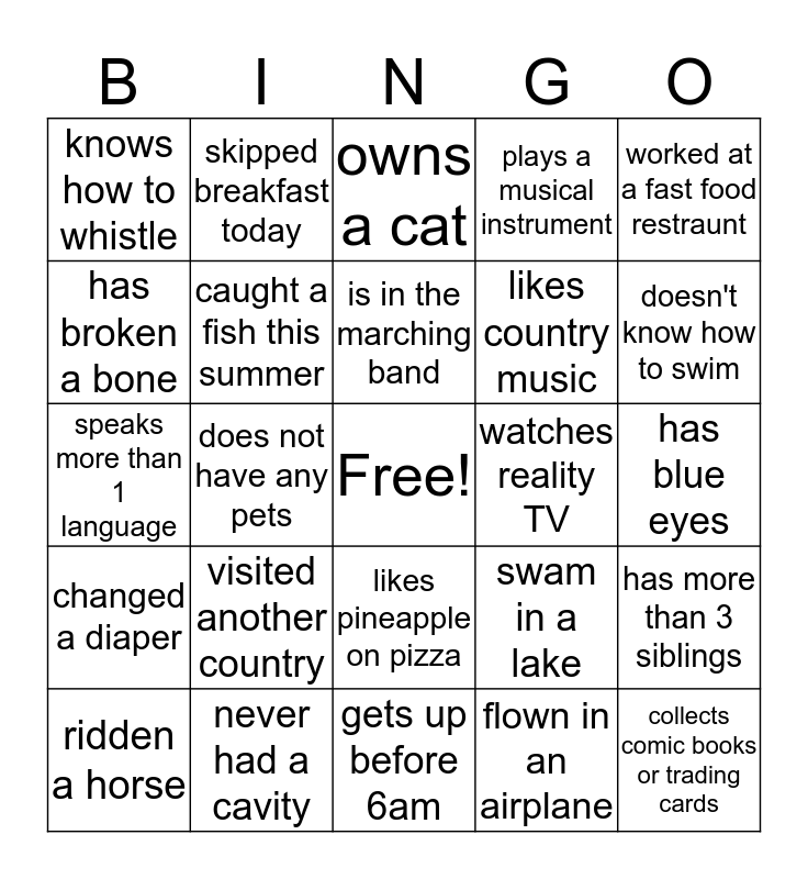 This bingo card has a free space and 24 words: visited another country, never had a cavity, is in the marching band, ridden a horse, worked at a fast food restraunt, knows how to whistle, has broken a bone, skipped breakfast today, watches reality TV, likes pineapple on pizza, likes country music, speaks more than 1 language, swam in a lake, has more than 3 siblings, caught a fish this summer, flown in an airplane, has blue eyes, owns a cat, doesn't know how to swim, does not have any pets, collects comic books or trading cards, changed a diaper, plays a musical instrument and gets up before 6am.