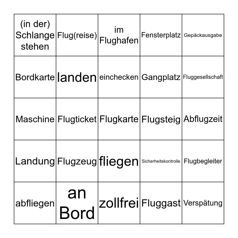 This bingo card has a free space and 24 words: Flugzeug, an Bord, einchecken, abfliegen, Gepäckausgabe, (in der) Schlange stehen, Bordkarte, Flug(reise), Flugsteig, fliegen, Gangplatz, Maschine, Sicherheitskontrolle, Flugbegleiter, landen, Fluggast, Abflugzeit, im Flughafen, Fluggesellschaft, Flugticket, Verspätung, Landung, Fensterplatz and zollfrei.