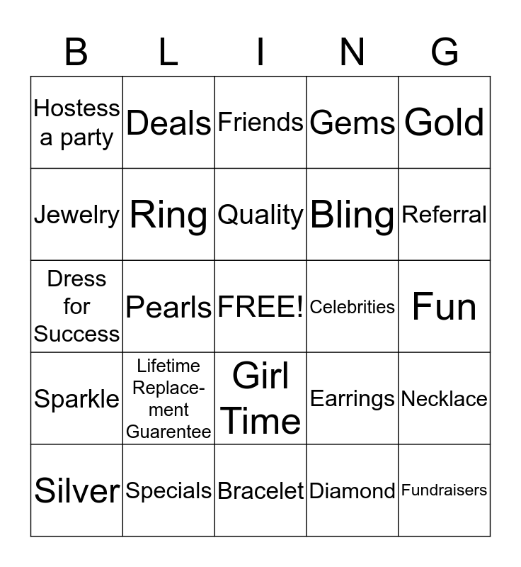 This bingo card has a free space and 24 words: Lifetime Replace- ment Guarentee, Specials, Quality, Silver, Gold, Hostess a party, Jewelry, Deals, Celebrities, Girl Time, Bling, Dress for Success, Earrings, Necklace, Ring, Diamond, Fun, Friends, Referral, Pearls, Fundraisers, Sparkle, Gems and Bracelet.