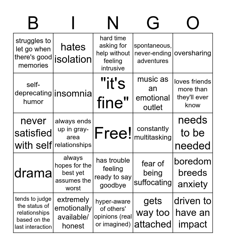 This bingo card has a free space and 24 words: tends to judge the status of relationships based on the last interaction, always hopes for the best yet assumes the worst, "it's fine", gets way too attached, oversharing, struggles to let go when there's good memories, hates isolation, hard time asking for help without feeling intrusive, constantly multitasking, needs to be needed, never satisfied with self, insomnia, fear of being suffocating, boredom breeds anxiety, self-deprecating humor, extremely emotionally available/ honest, hyper-aware of others' opinions (real or imagined), spontaneous, never-ending adventures, loves friends more than they'll ever know, drama, always ends up in gray-area relationships, has trouble feeling ready to say goodbye, music as an emotional outlet and driven to have an impact.