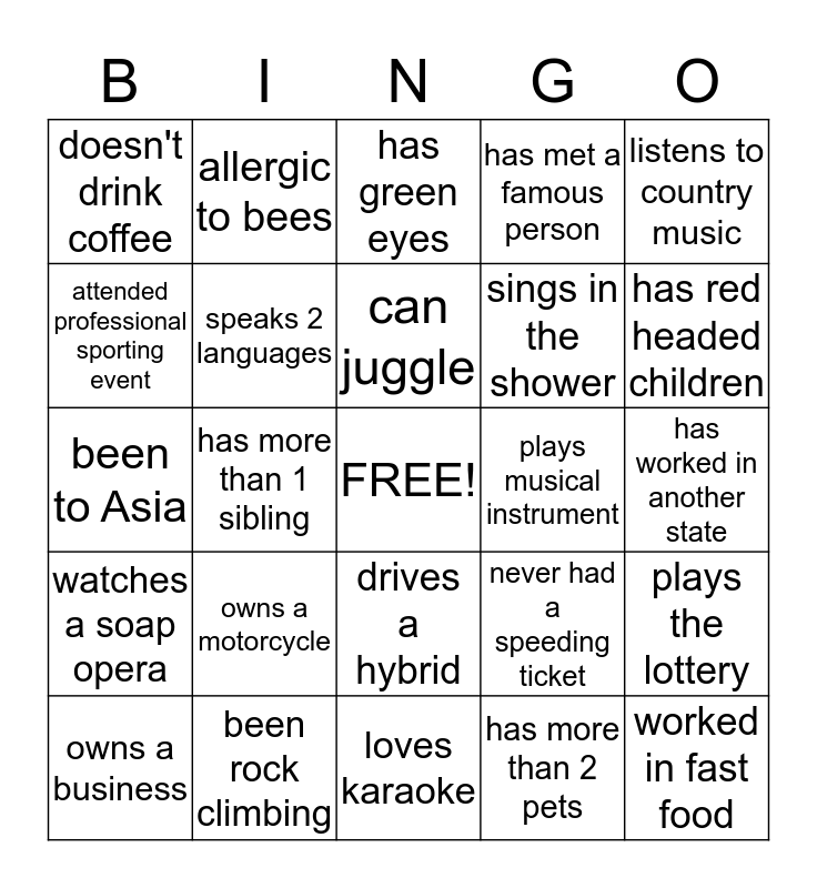 This bingo card has a free space and 24 words: owns a motorcycle, been rock climbing, can juggle, owns a business, listens to country music, doesn't drink coffee, attended professional sporting event, allergic to bees, plays musical instrument, drives a hybrid, sings in the shower, been to Asia, never had a speeding ticket, plays the lottery, speaks 2 languages, has more than 2 pets, has worked in another state, has green eyes, has red headed children, has more than 1 sibling, worked in fast food, watches a soap opera, has met a famous person and loves karaoke.