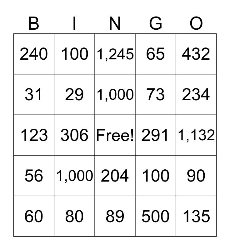 This bingo card has a free space and 24 words: 1,000, 80, 1,000, 60, 432, 240, 31, 100, 291, 204, 73, 123, 100, 90, 29, 500, 1,132, 1,245, 234, 306, 135, 56, 65 and 89.