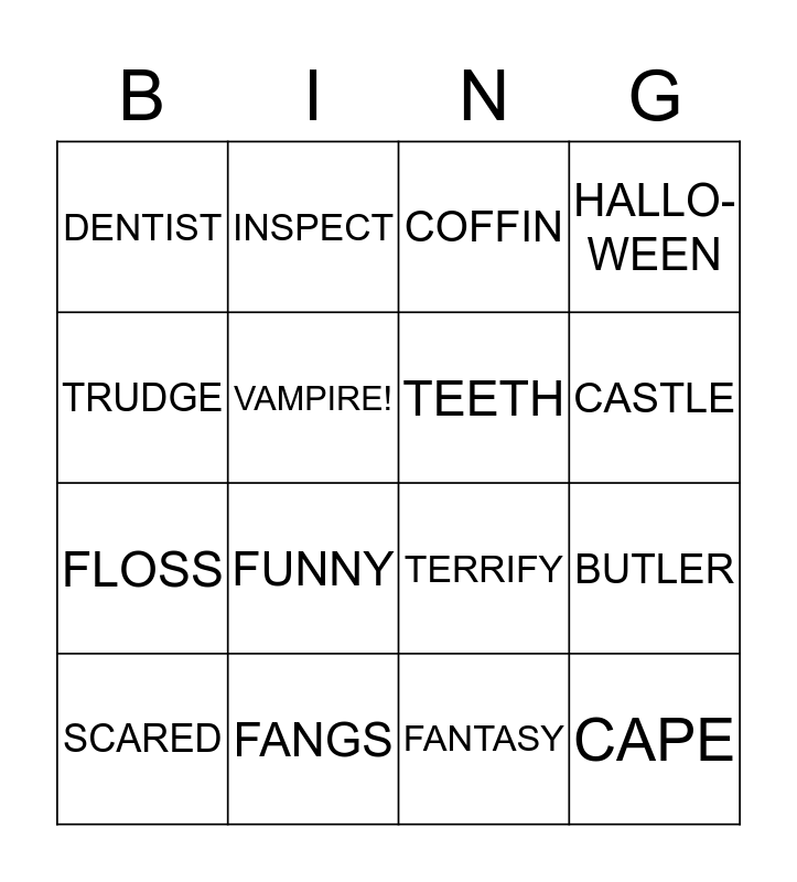 This bingo card has 16 words: FANGS, BUTLER, COFFIN, DENTIST, FLOSS, INSPECT, TERRIFY, FANTASY, TRUDGE, VAMPIRE!, SCARED, HALLO- WEEN, FUNNY, CASTLE, TEETH and CAPE.