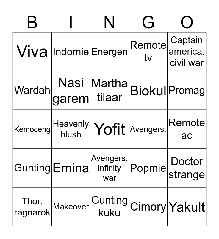 This bingo card has a free space and 24 words: Emina, Makeover, Martha tilaar, Thor: ragnarok, Captain america: civil war, Viva, Wardah, Indomie, Avengers:, Avengers: infinity war, Biokul, Kemoceng, Popmie, Doctor strange, Nasi garem, Cimory, Remote ac, Energen, Promag, Heavenly blush, Yakult, Gunting, Remote tv and Gunting kuku.